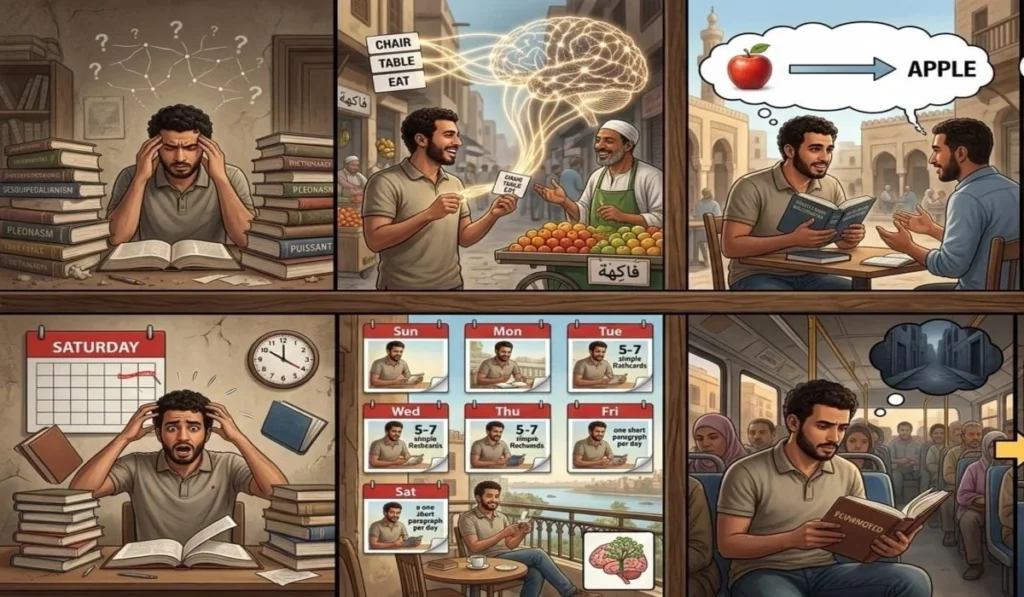 والطريقة الصح مش حفظ قوائم ومش مذاكرة إجبارية، هي بتكون بتعلم الكلمات في سياق ومراجعتها بانتظام واستخدامها فوراً في كلام حقيقي.