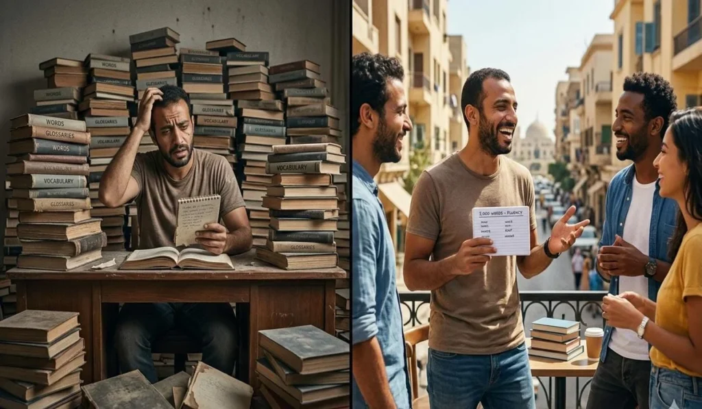 - بتتعلم كلمات نادرة وبتتجاهل الشائعة: ناس كتير بتتعلم كلمات ضخمة وصعبة وبتتجاهل الكلمات الشائعة اللي بتتقال كل يوم واللي بتخليك تفهم الكلام وتتحدث.